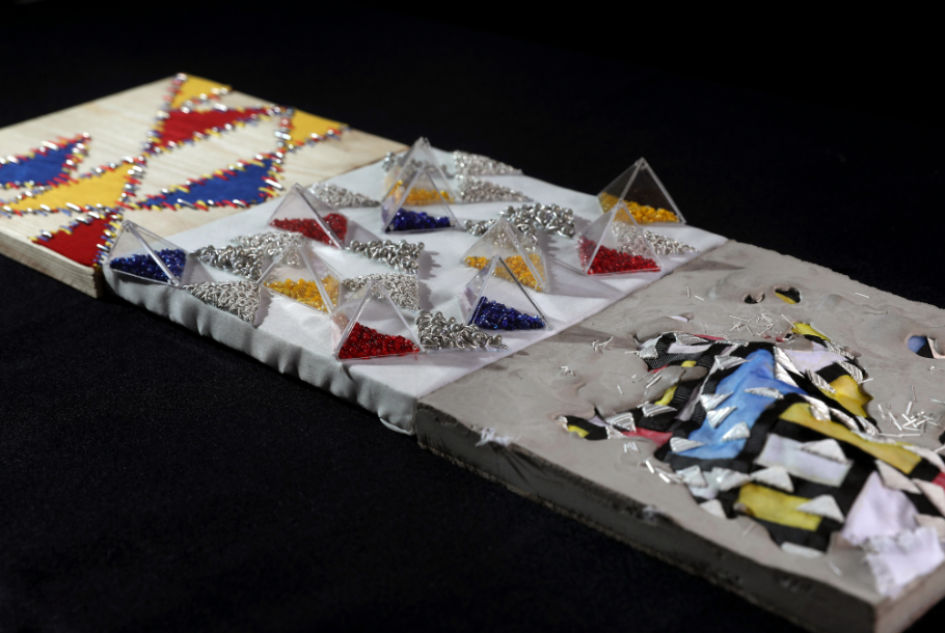 Dans le petit atelier du musée, inlassablement, Azélina perpétue les gestes ancestraux des Grenadières : elle monte la toile à beurre sur le métier à tisser, puis l’encolle avec un mélange de farine et d’eau. Par-dessus elle pose son feutre ou son drap de laine qu’elle va ouvrager grâce à un motif dessiné sur papier calque qu’elle a piqué puis poncé. L’étape est délicate, elle consiste à trouer le papier, puis à le saupoudrer d’une encre poudreuse qui va se transférer sur la matière. Ensuite, Azélina applique une découpe en carton pour donner du relief avant de commencer à broder son dessin. La brodeuse s’empare enfin de la précieuse spirale brillante, mate ou frisée et renforcée par un fil préalablement enduit de cire d’abeille pour le rendre lisse et résistant à l’usure du métal ; puis l’enroule sur son aiguille pour orner son tissu. « Le doigté est méticuleux, exigeant, passionnant et demande une grande régularité dans le point puisque je travaille au millimètre près. C’est un geste émouvant qui permet de s’exprimer et de débrider sa créativité en l’associant à ces savoir-faire » nous confie Azélina.