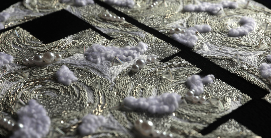 « Ce fut une expérience, un challenge technique, créatif et une chance incroyable de travailler dans ces ateliers où le luxe était mon quotidien ! » nous confie Azélina, qui aujourd’hui, aspire à plus de lenteur. Chez elle, elle crée à présent de petites pièces précieuses comme des bijoux avec le même amour, les mêmes techniques, les mêmes gestes précis et ce même « fil d’or qu’elle adore ». Azélina adapte la technique ancestrale à des pièces modernes et précieuses, elle manie avec précision le fil métallique lyonnais qui vient s’entortiller, tel un ressort, pour mieux capter la lumière, sur les formes en carton qu’elle brode avec patience et adresse.