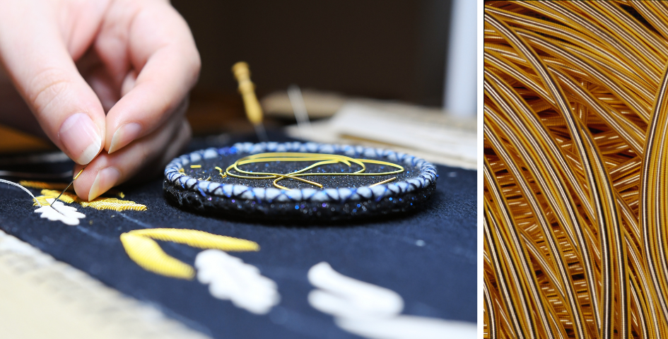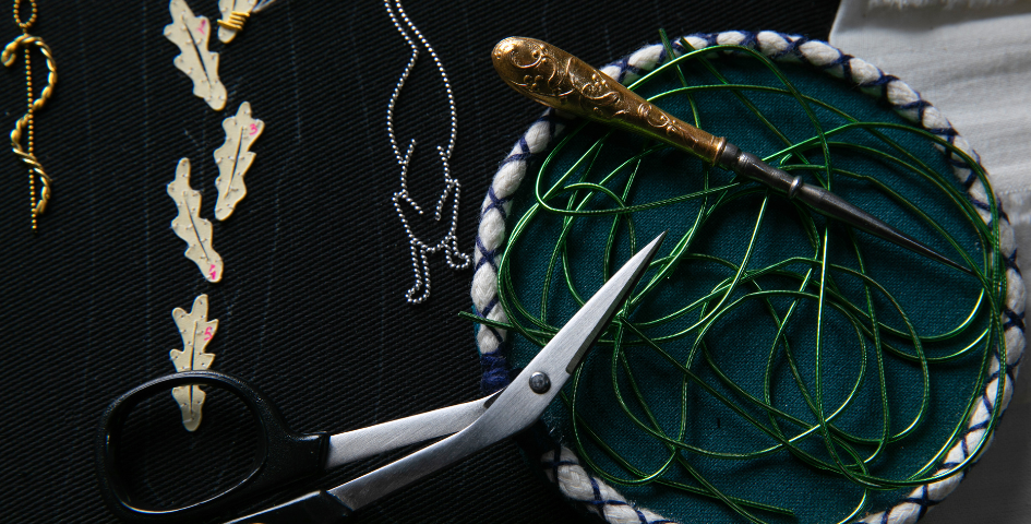 L’approvisionnement des fils se fait historiquement, et encore aujourd’hui, chez Carlhian, spécialisé dans la fabrication de dorures et passementeries dans la région lyonnaise. Outre des commandes illustres comme celles pour les Francs-maçons, pour les tenues d’académiciens brodées avec un fil de soie, ou pour des costumes de sous-préfètes ; le musée continue de faire vivre son patrimoine en collaborant avec d’autres savoir-faire comme les couteaux d’Art de Thiers ou de jeunes sociétés comme The Comptoir qui leur a récemment commandé des kits de broderie.