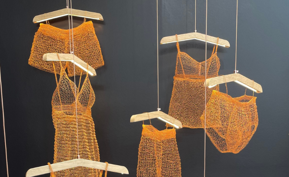 La Languochat crée des luminaires autour de la transparence. Fascinées par la lumière et attirées par les vêtements réalisés au crochet, ses créatrices diplômées des Beaux-Arts de Reims ont eu l’idée d’associer les deux éléments pour créer des sculptures éclairantes et aériennes. Réalisées en fil de cuivre tricoté et illuminées par une rangée de led incluse dans un cintre en bois, les « Lovers », sublimes suspensions uniques et faites à la main, ré-enchantent les pièces du dressing lingerie. Leurs textiles métalliques lumineux en formes de culottes, boxers, triangles, nuisettes, caracos, panties, leggings, bodies ou maillot de bain sont des éléments de décors idéals dans une vitrine, un magasin, un corner ou au-dessus d’un comptoir de caisse pour mettre en scène et sublimer une offre de sous-vêtements et/ou balnéaire. Les luminaires de La Languochat ont déjà séduit des hôtels et des boutiques de lingerie.