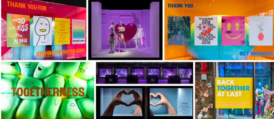 Après la fermeture des magasins dans de nombreux pays, les magasins du monde entier se sont empressés, dès leur réouverture, d'accueillir à nouveau leurs clients et n'ont pas hésité à entretenir un sentiment de communauté. À New York, de Ralph Lauren à Harvey Nichols, le nouveau mot d'ordre était « togetherness », que l’on pourrait traduire comme « convivialité » ; Macy s'est concentré sur « We Love NYC » et Saks 5th Avenue a dit à ses clients combien ils lui ont manqué. À Londres, l'emblématique Selfridge's a fait peau neuve avec des vitrines qui rendent hommage au National Health Service, tandis que la maison de couture française Louis Vuitton a dévoilé « The Rainbow Project », une nouvelle initiative qui habille les vitrines de ses magasins du monde entier de motifs d’arc-en-ciel. Les arcs-en-ciel ont orné les magasins de la 5e Avenue, à New York, ainsi que ceux de Beverly Hills et de Chicago, tout comme ceux de Paris, Rome Milan, Madrid, Francfort, Toronto et Mexico. Les arcs-en-ciel ont été soumis par des habitants de la région et, dans de nombreux cas, les motifs ont été dessinés par des enfants. Pour beaucoup, la couleur a été un élément fort pour communiquer le retour à une normalité, bien que différente, et en mettant l’accent sur l’importance de soutenir nos communautés.
