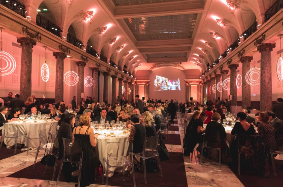 20h30 Les 270 invités sont amenés à rejoindre, en bas, le prestigieux Salon Mewès, avec sa magnifique verrière et ses colonnes de marbre spectaculaires, où ont été dressées les tables destinées à accueillir les convives autour d’un élégant dîner. Tout le monde prend place presque instinctivement et on salue ses « compagnons » de table, avec qui la soirée s’annonce déjà réussie.