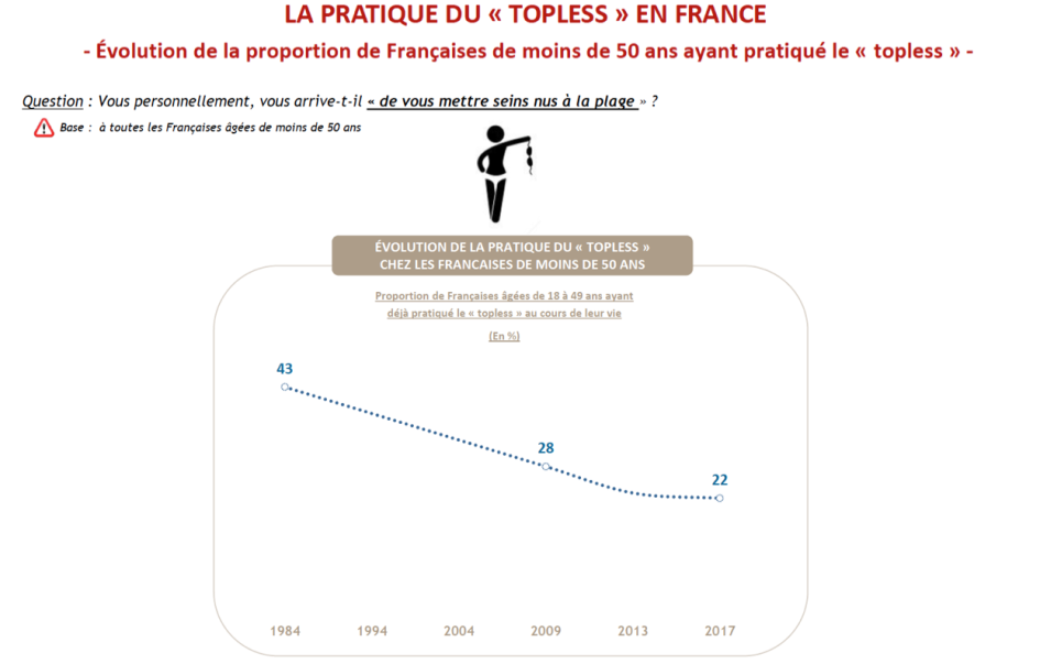 Symbole d'émancipation des femmes et de leurs corps observé sur les plages françaises à partir des années 1960, la pratique des seins nus apparait aujourd'hui en perte de vitesse chez les jeunes générations. D'après les résultats de cette enquête Ifop – Plaisx, seules 29% des Françaises ont déjà retiré leur haut sur une plage et le nombre d'adeptes du « topless » apparait en net recul par rapport aux années 80 : à peine 22% des femmes de moins de 50 ans admettent s'être déjà mises seins nus à la plage en 2017, contre 28% en 2009 et 43% en 1984.