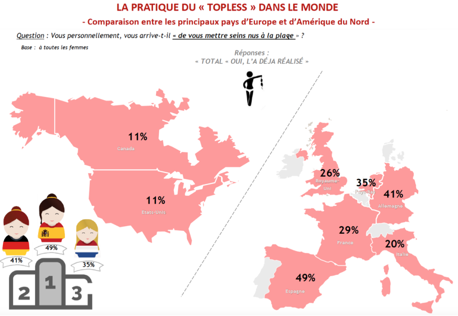 Le nombre d'adeptes en France (29%) est quant à lui à peine plus élevé qu'au Royaume-Uni (26%) mais sensiblement plus qu'en Italie (20%), pays très catholique où l'acceptation sociale de la nudité est encore faible. Habitant des pays où la législation sur le topless à la plage est globalement plus contraignante qu'en Europe, Américaines (11%) et Canadiennes (11%) ferment assez logiquement la marche de ce classement.