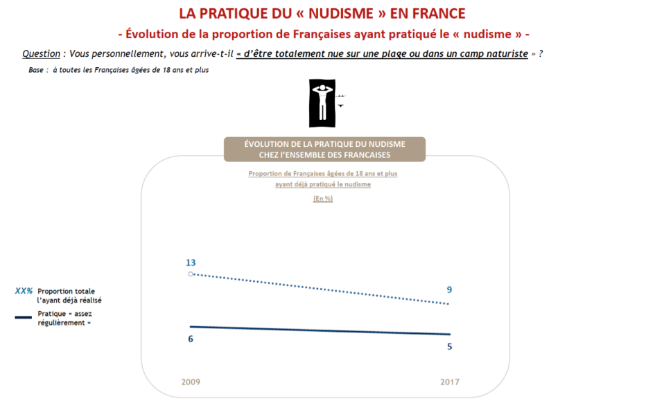 En France, le recul de la nudité sur la plage en été transparaît également dans la baisse de l'expérience du nu intégral, passée chez l'ensemble des Françaises de 13% en 2009 à 9% en 2017. Le noyau des adeptes du nudisme, c'est-à-dire celles s'y adonnant « assez régulièrement », s’avère toutefois assez stable entre 2009 (6%) et 2017 (5%). La France demeure ainsi un pays où la pratique du naturisme reste en deçà de ses voisins d'outre-Rhin même si les résultats tordent quelque peu le cou aux clichés selon lesquels les pays germaniques seraient forcément les patries en pointe du naturisme.