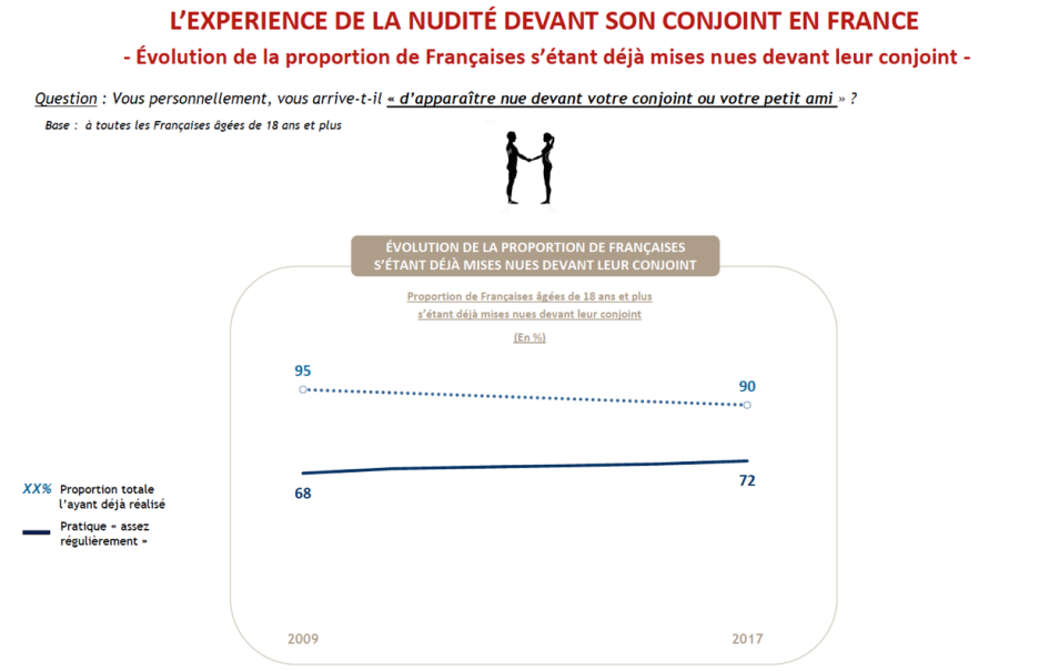Par exemple, la proportion de Françaises se présentant « assez régulièrement » nues devant leurs conjoints ou leurs petits amis est restée relativement stable entre 2009 (68%) et 2017 (72%), tout comme le nombre de femmes ayant déjà dormi nues au cours de leur vie (73% en 2009, 72% en 2017).