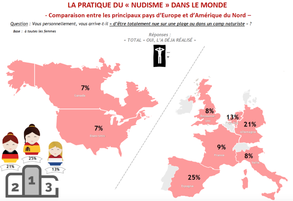 Elle dépasse ainsi largement les Pays-Bas, où en dépit d'une loi très libérale dans ce domaine (Il faut savoir qu’une loi entrée en vigueur en 1986 autorise la nudité partout, sauf sur la voie publique ou lorsqu'elle constitue une gêne pour les autres) les femmes sont beaucoup moins nombreuses qu'en Allemagne à s'être déjà dévêtues intégralement (13%). Dans les autres pays européens investigués, l'expérience de la nudité intégrale est un peu plus faible qu’en France (8% au Royaume-Uni et en Italie) mais plus forte qu’en Amérique du Nord (7% aux USA et Canada) où, de par le puritanisme ambiant, la nudité reste culturellement associée au sexe.