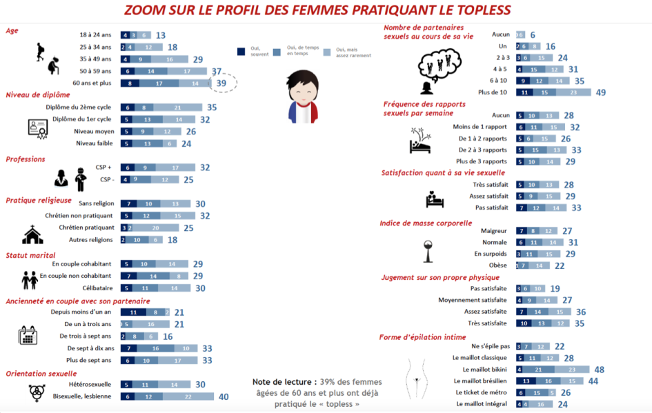 L’observation de la pratique du topless chez les femmes françaises nous renseigne sur des caractéristiques particulièrement intéressantes à étudier. Cette pratique est davantage le propre de femmes mûres que celui des jeunes générations. Elle touche par ailleurs des profils au niveau culturel élevé avec une tendance marquée pour le vote à droite de l’échiquier politique.