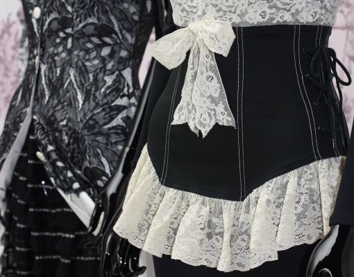 A l’entrée de l’exposition, quelques pièces de dentelle noire transparente attendent que vous veniez les délivrer. Ensuite vous serez libre d’aller explorer, à votre guise, quelques thèmes récurrents, chers à la créatrice. Au hasard, vous croiserez quelques femmes libérées des années 80 & 90, des amoureuses romantiques, des lolitas troublantes, de fausses ingénues, des femmes fatales et, enfin, des soubrettes aguicheuses et une mariée bien délurée. Et tout cela dans une envolée de matières, de coloris, d’imprimés et d’accessoires que l’exposition laisse découvrir au visiteur…