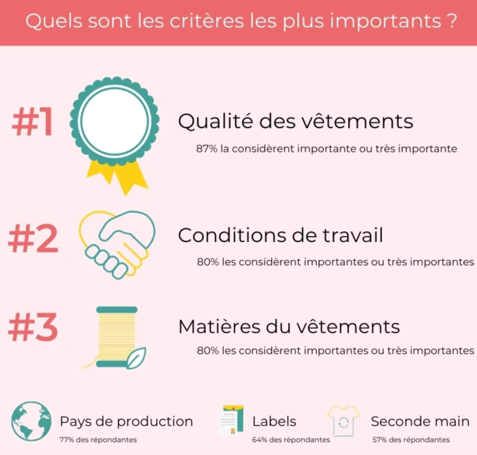 Le pays de production arrive en 3ème position, probablement sous l’influence des multiples campagnes autour du « made in France » visibles depuis quelques années. Les Françaises veulent favoriser le circuit court et souhaitent encourager l’économie locale.