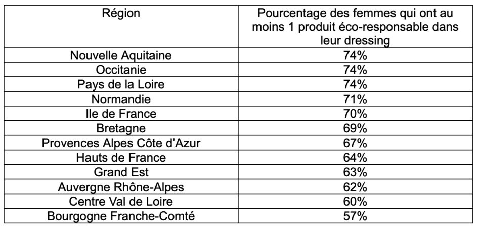 En dernière position on retrouve les habitantes de la Bourgogne Franche-Comté où seulement 57% des répondantes ont déclaré avoir au moins une pièce éco-responsable dans leur dressing.