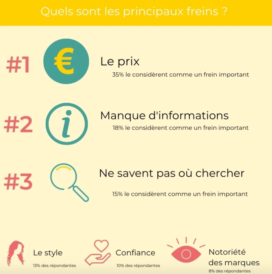 Sans surprise, le prix est le principal frein à l’achat de vêtements éco-responsables et éthiques (35%). Viennent ensuite, pour 18% des répondantes, le manque d’informations claires sur les produits ainsi que le fait de ne pas savoir où chercher pour 15% d’entre elles. Enfin, 13% des femmes interrogées déclarent que c’est le style qui les freine et 10% d’entre elles évoquent la crainte du greenwashing.