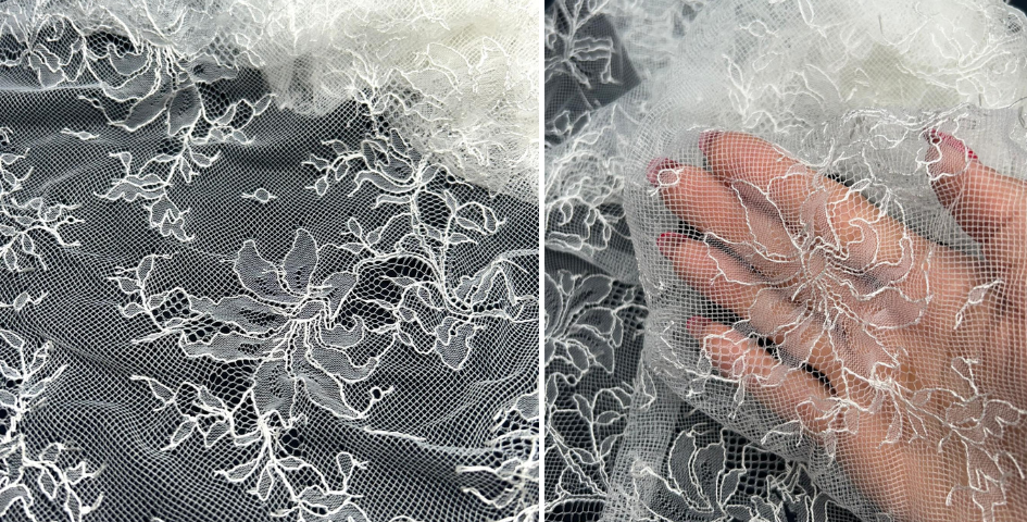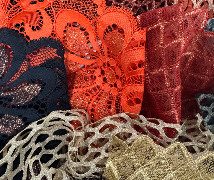 Légèreté et raffinement pour la lingerie A/H 2026-27 : aériennes et précieuses, les nouvelles dentelles réalisées sur métiers jacquartronic rappellent l’esthétique des anciennes Leavers chantilly, cela grâce à un fil ultra léger pour la base et des dessins soulignés par un fil de viscose brillant, sans remplissage ; les nouveaux designs graphiques expérimentent macro motifs, dessins abstraits et fonds très ouverts ; de nouvelles applications et finitions confèrent matière et caractère aux tissus, invitant à toucher l’effet « dévoré » obtenu grâce à une lamination particulière ; enfin, place à la brillance avec des éléments lurex en allover sur une dentelle, à associer à un tulle 100 % lurex… pour des modèles sophistiqués.