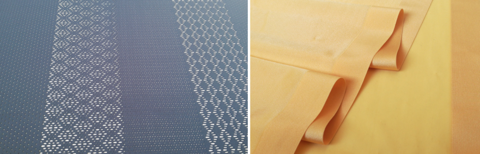 Suite à l’investissement récent dans de nouvelles machines haute technologie, Penn Italia/Penn Textile Solutions intègre aujourd’hui toutes ces solutions au sein du même tissu. On retrouve ainsi : de nouveaux styles lingerie qui jouent sur des parties renforcées, séparées par des zones de différentes élasticités et de motifs floraux placés ; des tulles plus ouverts et plus fermés, alternés avec des motifs perforés, ajourés et rayures en relief pour de nouveaux modèles shapewear ; et, encore, des laizes opaques avec bords élastiques intégrés qui simulent un ruban brillant, pour une application parfaite dans les soutiens-gorge et modèles axés sur le maintien… Ces solutions « toutes en un , qui viennent maximiser le confort tout en minimisant les coutures et le travail des matières, peuvent toutes être développées avec des fils recyclés et différents finissages, de l’imperméabilité à l’effet rafraîchissant.