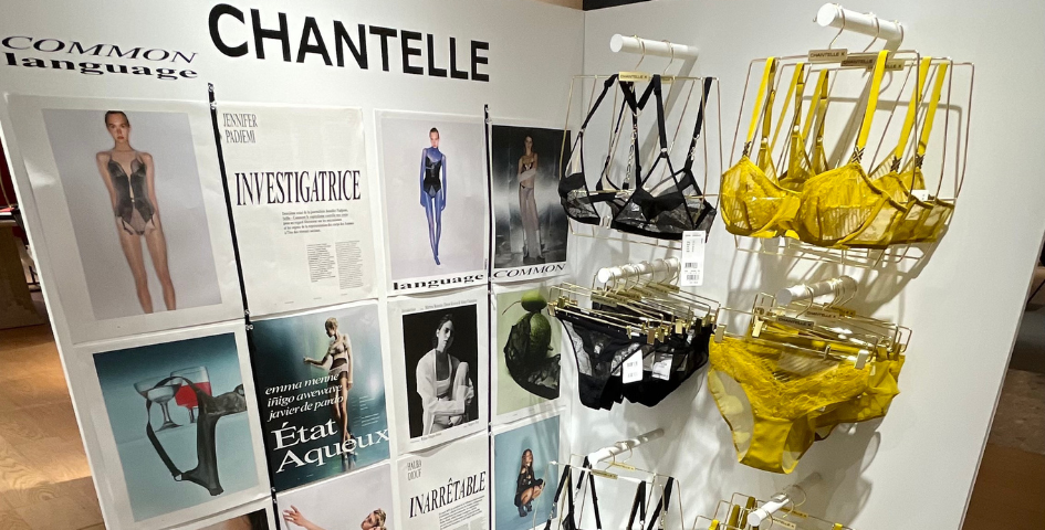 Un corner qui s’articule autour du magazine numéro 9 « Common Language » publié par le groupe Chantelle, sous la Direction Artistique de Renaud Cambuzat et intitulé « Tomorrow’s Myths ». Aux côtés des dernières collections printemps-été 2024 de Chantelle X et de SoftStretch, il est question d’une écriture universelle, celle « des corps qui racontent une histoire », d’Art, de photographies et d’émotions qui ouvrent un « dialogue au-delà des stéréotypes ». Un espace qui met en lumière ses lignes de lingerie les plus audacieuses et ses nouvelles générations de sous-vêtements inclusifs sur lesquels le groupe capitalise pour l’avenir. Présentés comme sur des grandes pages blanches de livres ouverts, soutiens-gorge et culottes invitent à une nouvelle lecture de la sexiness « qui place la qualité, la créativité et la simplicité au cœur de la démarche » de Chantelle.