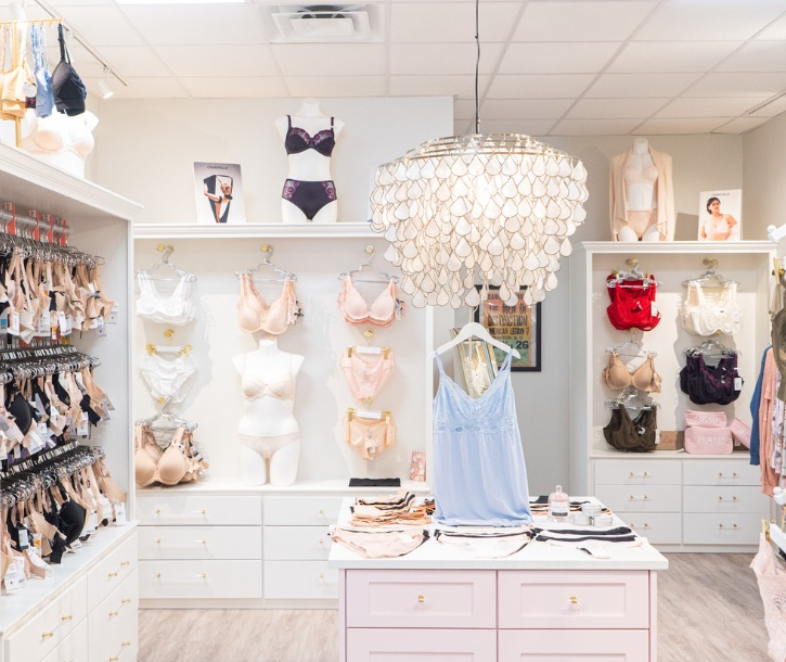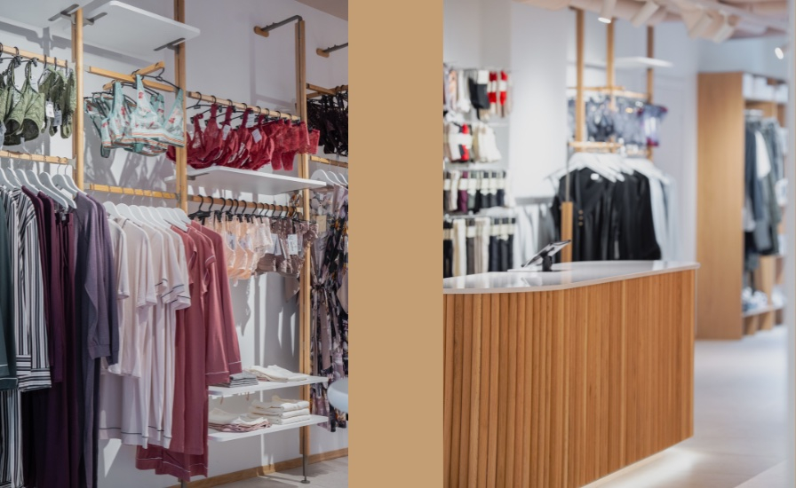 La nouvelle boutique séduit d’emblée par son atmosphère apaisante : tons doux, matières naturelles, lumière tamisée et végétation subtile composent un décor à la fois contemporain et intime. Tout est pensé pour faire de l’achat de lingerie une expérience de bien-être. Le comptoir d’accueil, aux lignes arrondies et habillé de bois clair, illustre à lui seul la philosophie d’Helene : simplicité, élégance et bienveillance.