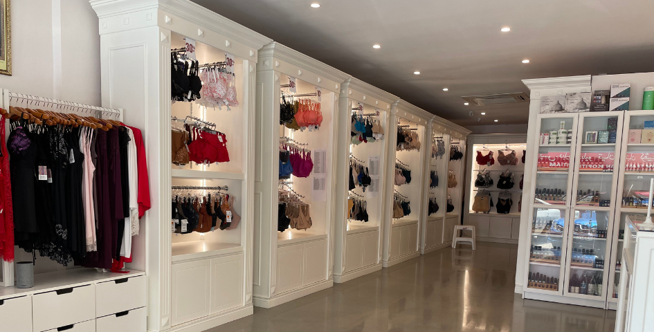 A l’intérieur, murs et mobiliers blancs, sol en béton poli et éclairage chaud signent ce décor contemporain et accueillant. De grandes armoires ouvertes permettent aux clientes de découvrir facilement la vaste gamme de produits lingerie, grandes tailles, nuit et loungewear, tandis qu’une vitrine propose aussi une sélection de produits de beauté. Lilli Yong est fière d’être la première spécialiste en bra-fitting du Brunei, avec en poche une certification de la Eveden Fitting School de Londres. Son objectif ? S’assurer que chaque cliente reparte avec le soutien-gorge fait pour elle. La boutique propose ainsi, en plus d’un service de retouches gratuit, des soutiens-gorge post-mastectomie et des prothèses pour les femmes atteintes d’un cancer du sein.