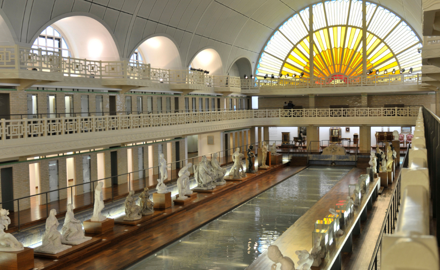 Installé dans une ancienne piscine municipale transformée en musée, le lieu ne se contente pas d’accueillir l’exposition : il la conditionne. Bassin central conservé, cabines devenues vitrines, lumière filtrée par les vitraux, tout concourt à une lecture particulière des œuvres, entre mise à distance et immersion.