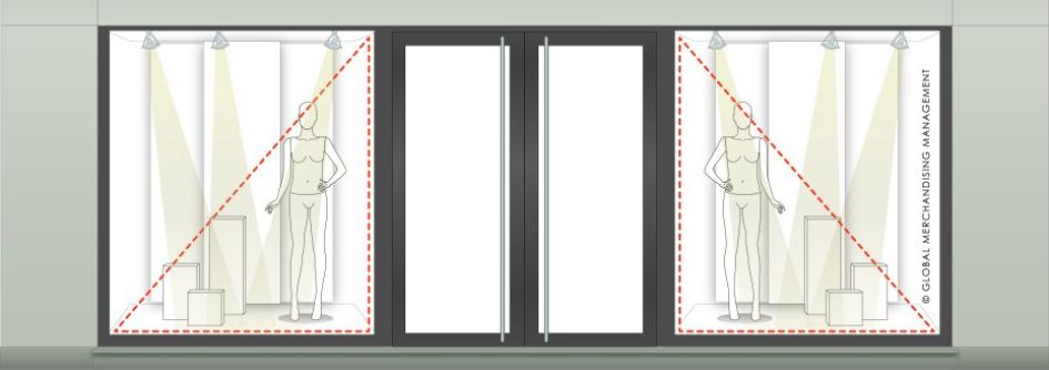 Afin de créer du rythme et de profiter des différents plans de la vitrine, il est préférable de privilégier les présentations en nombre impair. Ainsi, on installera 3 mannequins ou 3 bustes plutôt que 2 ou 4, et afin de dynamiser encore plus la vitrine, on regroupera ces mannequins sur les lignes fortes de la vitrine (2 lignes fictives qui séparent l’espace en 3 parties égales). Les messages importants que doit véhiculer la vitrine doivent être placés sur ces lignes fortes qui sont donc des zones statégiques . Si toutefois, la vitrine doit comporter 2 mannequins, il est préférable que ceux-ci aient des positions et des attitudes bien distinctes et soient vêtus de manière différente, de façon à éviter que le regard du chaland hésite entre les 2 mannequins et ne sache pas sur lequel des deux se poser. Enfin, il est conseillé de disposer les produits de façon parallèle au sens de circulation, en évitant les lignes obliques, qui donnent une impression négative et de « fouillis visuel » à l’ensemble de la vitrine.