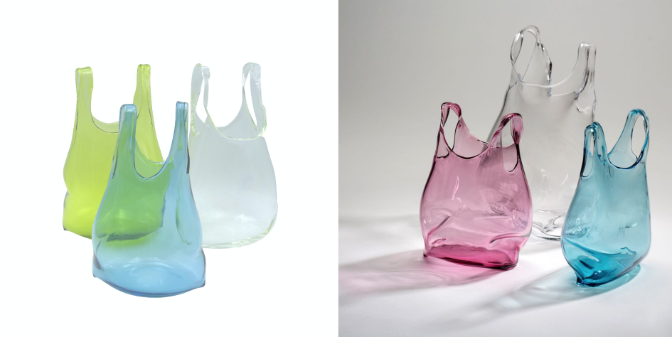 Chez Intima, on aime tout particulièrement la ligne « Déballe ton sac » (notre grande photo), vraiment insolite, qui comprend des vases en verre soufflé – pour un prix de vente public de 275 à 395 euros – signés par le duo d’artistes Anne Donzé et Vincent Chagnon et qui se déclinent en vert olive, bleu turquoise, bleu de cobalt, rose, jaune safran et incolore. L’illusion est incroyable.