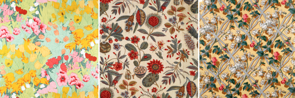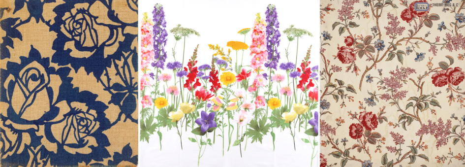 Les bouquets de fleurs sont empruntés aux natures mortes pratiquées par les peintres fleuristes et sont autant de sources d’inspiration pour les dessinateurs des manufactures de toiles peintes. Sous le Second Empire, les fleurs coupées ou en pot se répandent dans les intérieurs grâce à l’essor de la production horticole. Une mode décorative qui donne lieu à de véritables trompe-l’œil dans les étoffes pour ameublement et qui se décline en plus petits pour le vêtement.