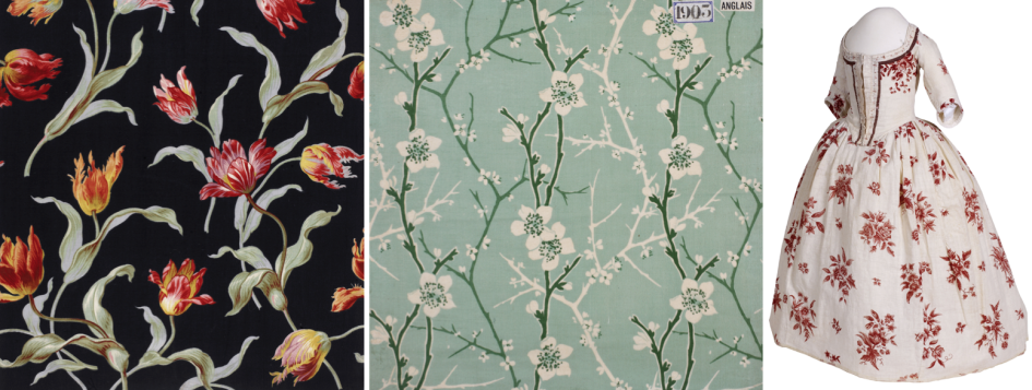 Les fleurs jouent un rôle essentiel dans les processus créatifs de la production des étoffes. Dès l’Antiquité, la flore inspire palmettes et fleurettes, mais il faut attendre le siècle des Lumières pour que l’imitation de la nature gagne des tissus avec une inventivité sans cesse renouvelée. Au XVIIIe siècle, une « fleur » désigne aussi une étoffe nouvelle. Cette terminologie montre que la mode et la fleur sont désormais indissociables de l’industrie textile pour l’ameublement comme pour le vêtement.