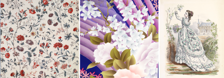 Depuis le XVIIIe siècle, l’imprimé floral, motif associé au printemps, particulièrement apprécié dans le vêtement féminin et les accessoires de mode, a connu de nombreuses déclinaisons. Année après année, les fleurs, naturalistes ou stylisées, continuent d’inspirer les dessinateurs industriels et les créateurs.
