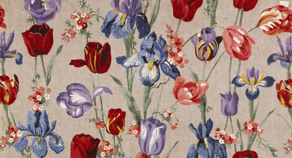 La tulipomanie s’empare de l’Europe au XVIIe siècle. Symbole de l’amour en Asie mineure, la tulipe (comme l’œillet) est fréquemment représentée dans les toiles aux Indes et en Perse. En Europe, les indienneurs l’associent à d’autres fleurs cultivées. Les formes de pétales et de la tige, très graphiques, favorisent l’imagination des créateurs pour des motifs réalistes ou géométriques.