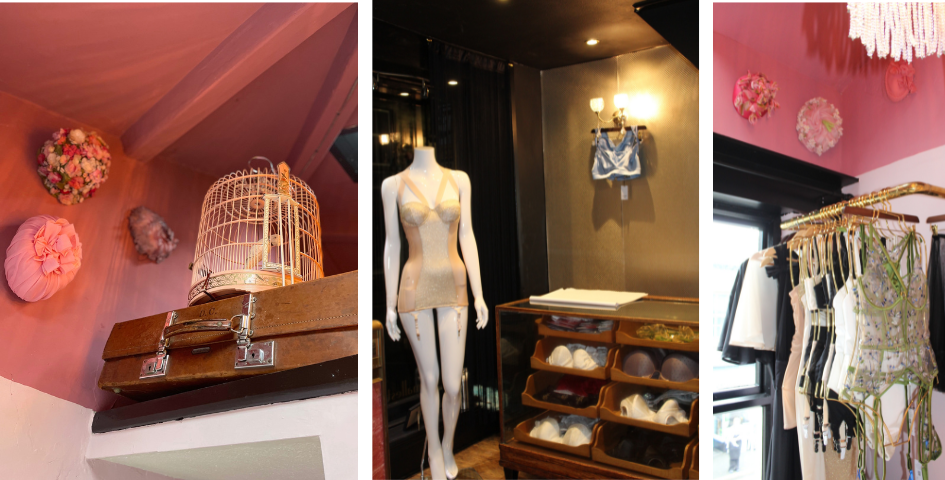 À l’intérieur, l’espace de seulement 9 m² répartis sur deux niveaux, a été redécoré pour cette importante réouverture : sur fond de rose, le mobilier de style art déco s’inspire de l’opulence et du somptueux capitonnage du Venice Simplon Orient Express, que Jenna a eu le plaisir d’emprunter lors de sa lune de miel. Le petit escalier en bois, flanqué d’une mosaïque de carreaux dorés, invite à se rendre à l’étage supérieur où des tringles en laiton savamment positionnées à différentes hauteurs viennent maximiser l’espace d’exposition de la lingerie fine. Des textiles raffinés, des meubles anciens, une sélection de chapeaux vintage et une coiffe burlesque des années 30 confèrent à la boutique un esprit délicieusement rétro. Jenna est en train d’étoffer son offre avec de belles marques britanniques et internationales haut de gamme. Elle prévoit aussi de louer sa boutique à des photographes et des marques pour leurs shooting photos.