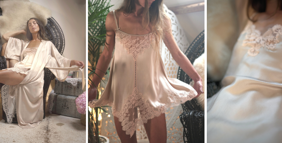 À l’image d’un vestiaire trouvé dans une malle ancienne, ses créations évoquent l’éclat feutré des années 1920, le charme des voyages d’antan et l’art de vivre avec lenteur. Lingerie, nightwear ou resortwear deviennent ainsi des fragments de mémoire, délicats et poétiques, sublimant une féminité libre, douce et assumée.