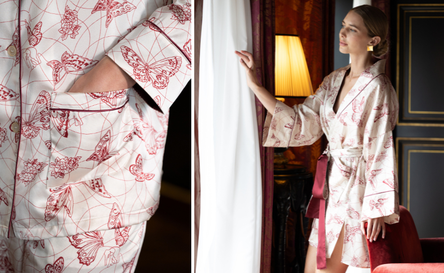Composée de pièces uniques confectionnées dans les plus belles soies – un ensemble de pyjama, un kimono et un masque pour les yeux réversible –, cette capsule incarne la féminité dans la plus pure tradition de l’art de vivre sophistiqué. Chaque création est ornée d’un motif exclusif inspiré d’un rare pochoir japonais Art déco (katagami), spécialement imaginé par le label milanais. Dessinée à la main, cette composition poétique met en scène une rencontre entre deux symboles : le papillon, allégorie de la transformation chère à Morpho + Luna, et l’éléphant, gardien bienveillant de La Réserve.